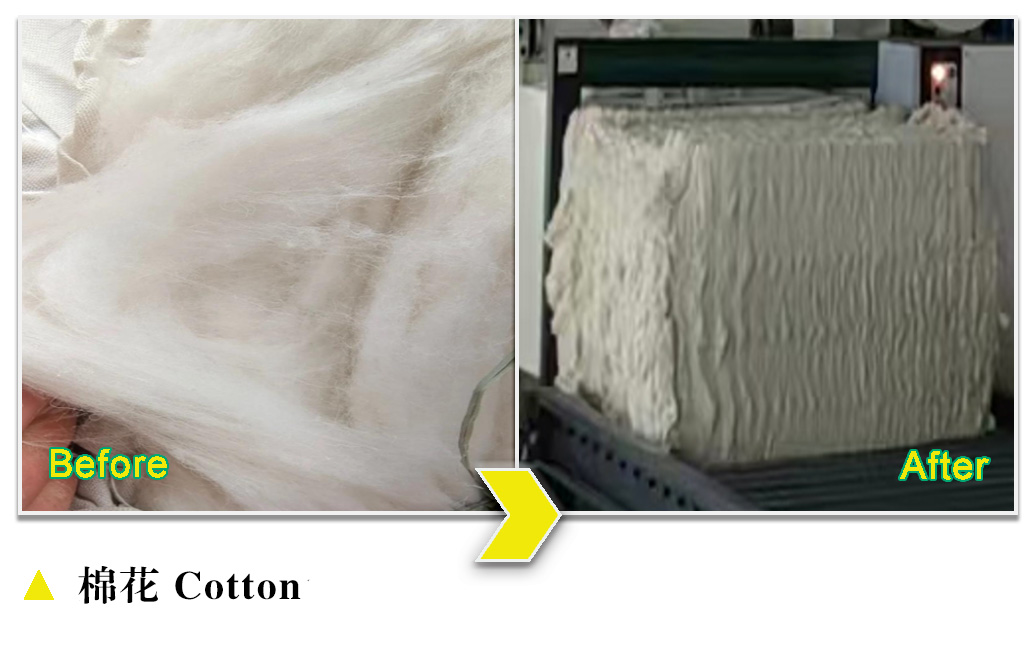 화학 처리 후 면을 탈수, 건조, 재포장하여 부드럽고 푹신한 감촉으로 복원합니다. -